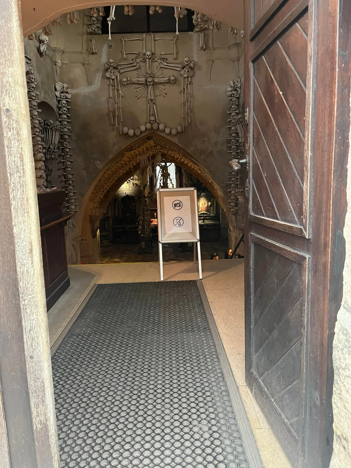 Inne i Sedlec-ossuariet (knokkelkirken) var det ikke lov å ta bilder, men interiøret besto av lysekroner, vegger og dekor laget av ca. 40 000 menneskeknokler. Atmosfæren var spesiell, men rommet var mindre enn jeg hadde trodd, og jeg ble litt skuffet. Husk også at dette er en turistattraksjon, men fortsatt en gravplass for mange, vær respektfull.